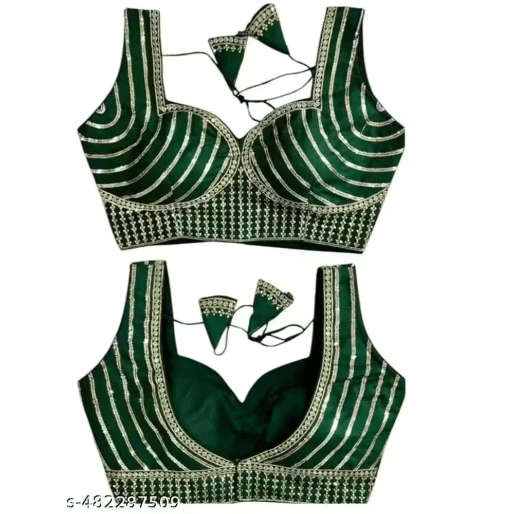 Green soft silk party blouse features elegant zari and sequin embroidery work. Perfect for parties and special occasions, it offers a stylish and graceful look.